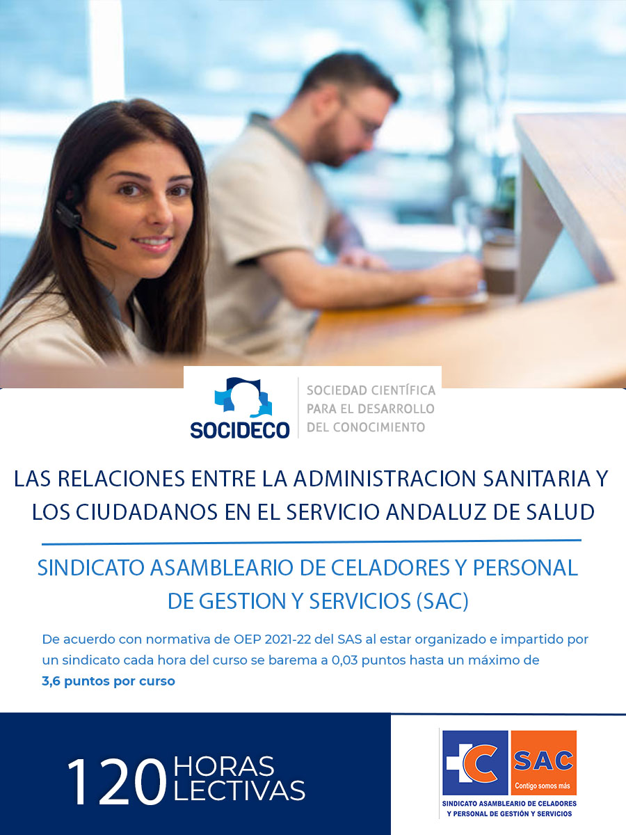 Entidad que acredita: Curso organizado e impartido por el SINDICATO ASAMBLEARIO DE CELADORES Y PERSONAL DE GESTION Y SERVICIOS (SAC) presente en el sector sanitario y en donde SOCIDECO participa como centro colaborador