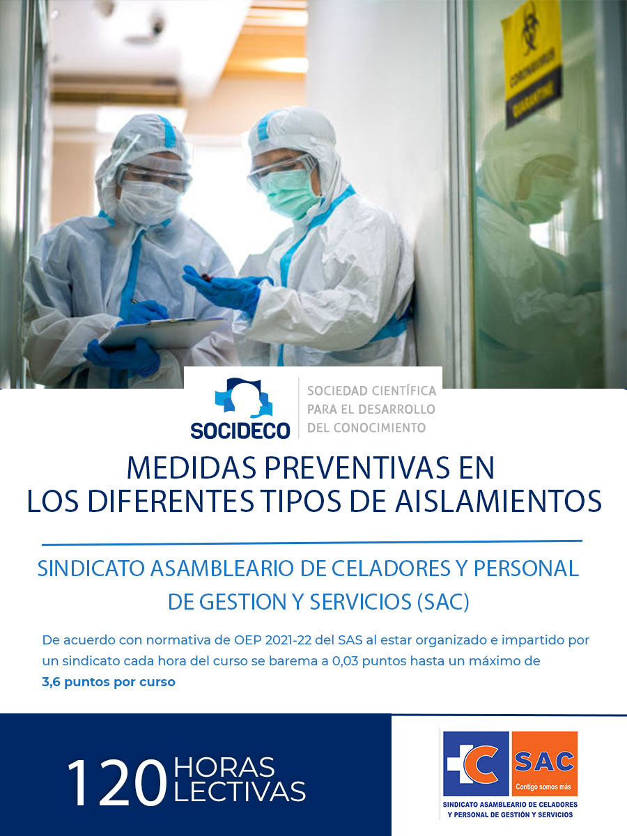 Curso organizado e impartido por el SINDICATO ASAMBLEARIO DE CELADORES Y PERSONAL DE GESTION Y SERVICIOS (SAC), presente en el sector sanitario y en donde SOCIDECO participa como centro colaborador. La presente actividad formativa se desarrolla bajo la modalidad online, reúne los requisitos para ser baremada en la bolsa de trabajo del SAS de acuerdo con la normativa vigente y en futuras convocatorias de concurso oposición del SAS de acuerdo con la última normativa publicada para el personal de gestión y servicios en sus diferentes resoluciones.