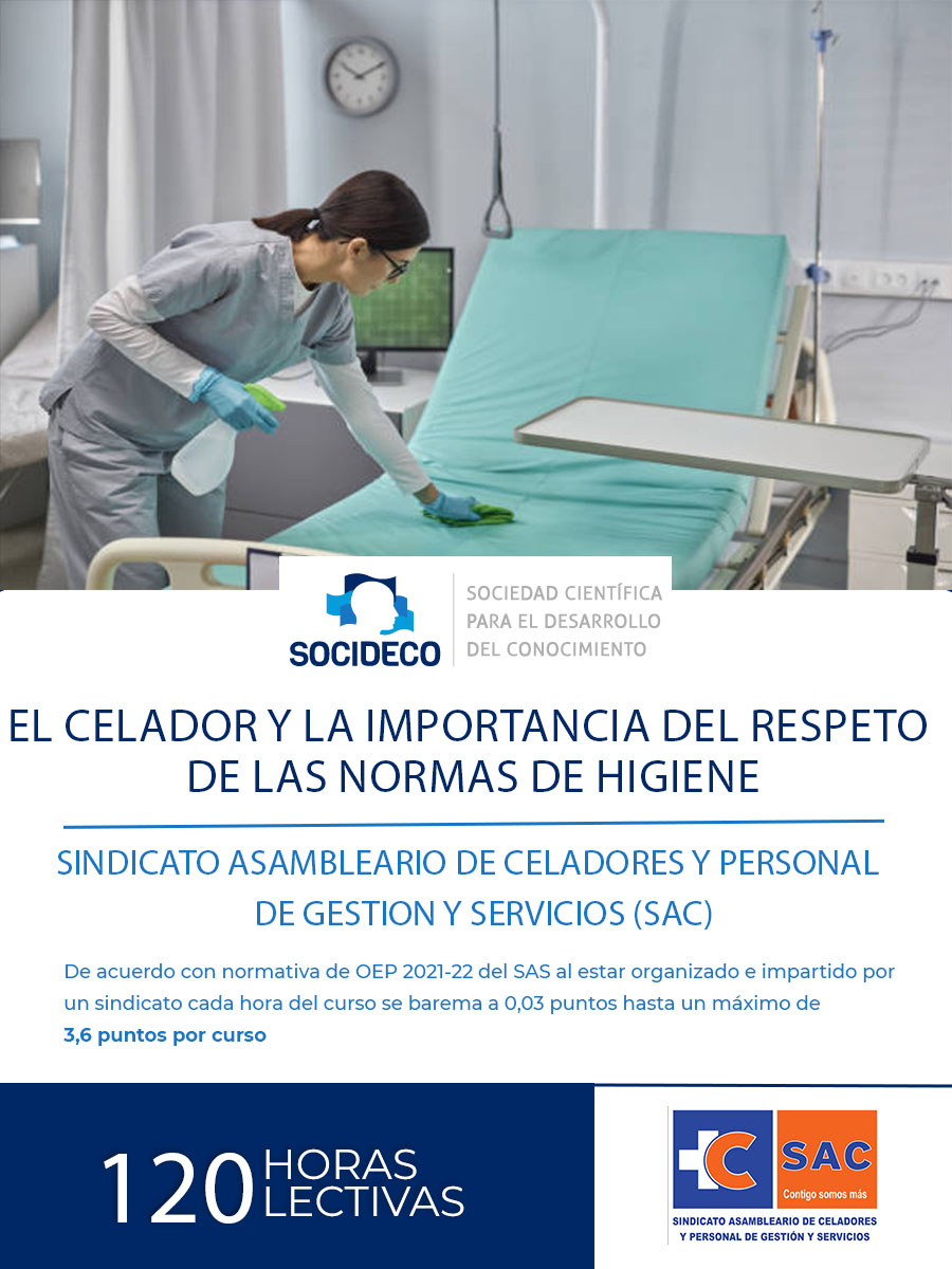 Curso organizado e impartido por el SINDICATO ASAMBLEARIO DE CELADORES Y PERSONAL DE GESTION Y SERVICIOS (SAC), presente en el sector sanitario y en donde SOCIDECO participa como centro colaborador. La presente actividad formativa se desarrolla bajo la modalidad online, reúne los requisitos para ser baremada en la bolsa de trabajo del SAS de acuerdo con la normativa vigente y en futuras convocatorias de concurso oposición del SAS de acuerdo con la última normativa publicada para el personal de gestión y servicios en sus diferentes resoluciones.